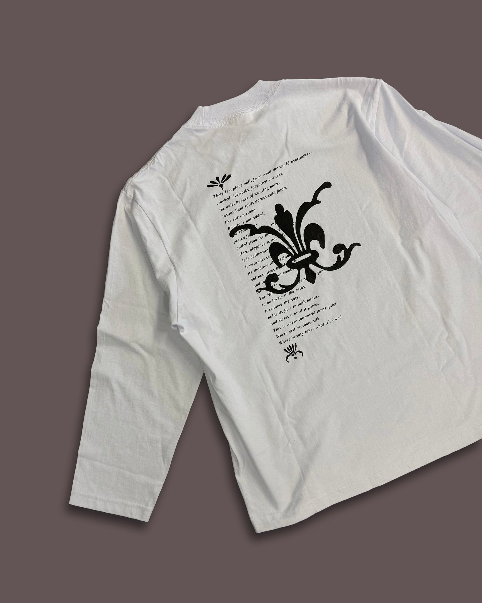 Heavy weight cotton long sleeve tee with screen printed artwork on the front and back.